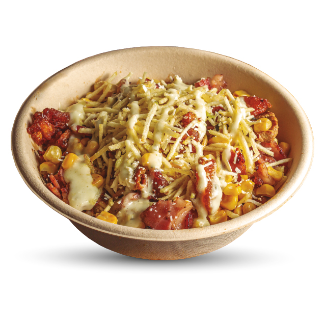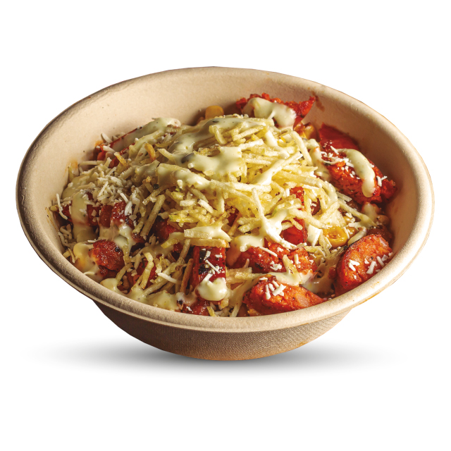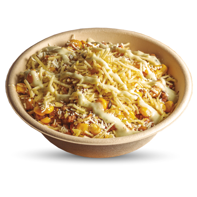 Maíz dulce desgranado, carne y pollo salteados con salsa bbq, queso, salsa tártara y papita perro.