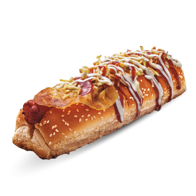 Salchicha americana a la parrilla, queso, cebolla, papita perro y salsas.